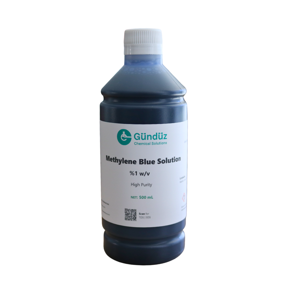 Gündüz Kimya laboratuvarlarında yüksek kalite standartlarına uygun olarak formüle edilen %1 Metilen Mavisi Solüsyonu, hem profesyonel kullanımlar hem de akvaryum ekosistemleri için özel olarak üretilmiştir. Yüksek saflıkta (High Purity) hammaddeler kullanılarak deiyonize su ile hazırlanan bu solüsyon, kalıntı veya tortu bırakmaz. Farklı boyutlarda, ışık geçirmeyen dayanıklı ambalajı sayesinde uzun raf ömrüne sahiptir ve aktifliğini korur.